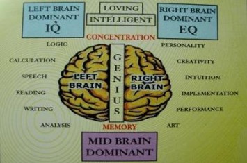 Sedangkan tugas otak kiri adalah yang selalu berhubungan dengan angka-angka, bahasa analisa, logika, intelektual, ilmu pengetahuan. Adapun otak kanan bertanggungjawab dalam hal imajinasi, kreativitas, seni, music, inovasi, daya cipta, intuisi, otak bawah sadar, keikhlasan, kebahagiaan, spirit, keuletan, kejujuran, keindahan dan lain-lain. Selain diurusi oleh otak kiri, juga menjadi urusan otak kanan.